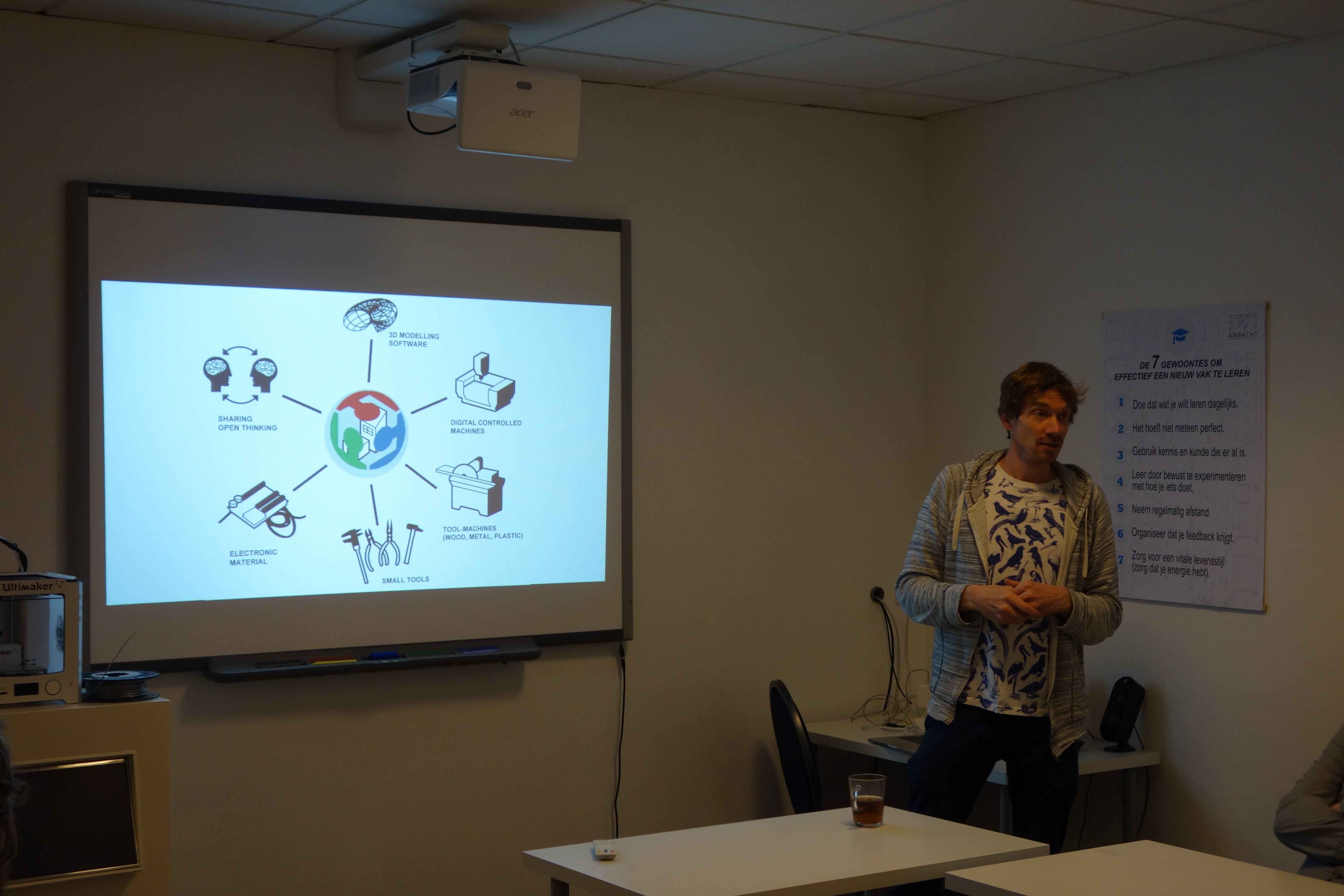 In de gastles ging hij niet alleen in op de diverse printprojecten die hij heeft uitgevoerd en waar hij mee bezig is, maar hij vertelde ook over de veranderingen die de opkomst van de digitale fabricage gaat veroorzaken.